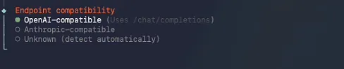 选择模型兼容的接口类型,这里选择OpenAI兼容模式: