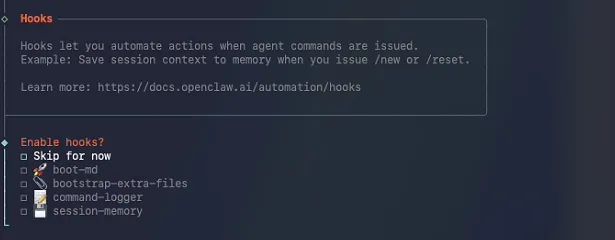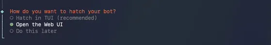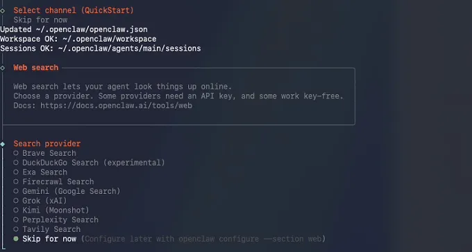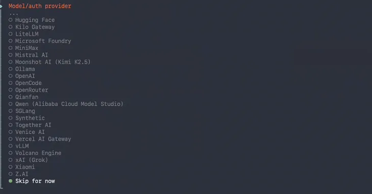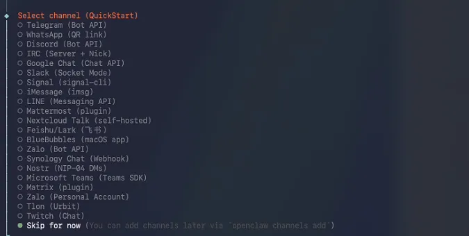 下一步选择配置连接的在线渠道,这个可以后续在web页面中配置,所以这里我们直接选择Skip for now跳过: