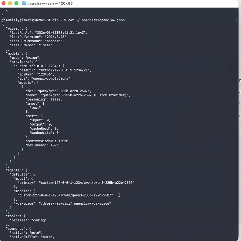 配置文件是用户目录下.openclaw文件夹下的openclaw.json,查看配置文件内容(配置可以手动修改或者在web页面中修改):