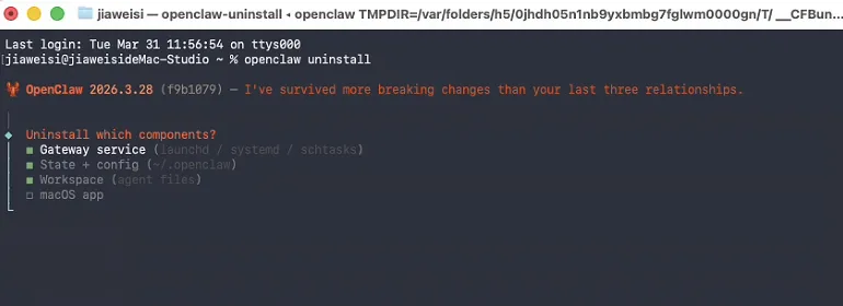 openclaw uninstall选择需要卸载的服务(空格键选择,选项前面格子变成绿色填满状态为选中):