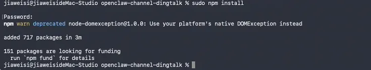 cd openclaw-channel-dingtalk安装依赖环境(需要sudo权限):