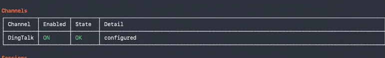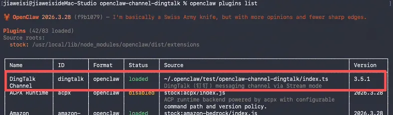 输入下面命令查看openclaw插件安装情况,看我们的钉钉插件是否安装成功: