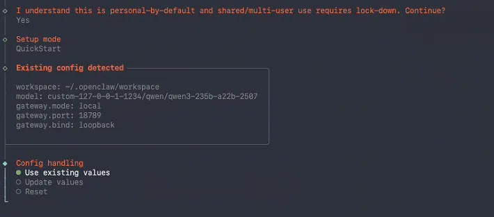 openclaw onboard因为其他项目已经配置了,这里到配置处理的这里直接选择使用现有的配置: