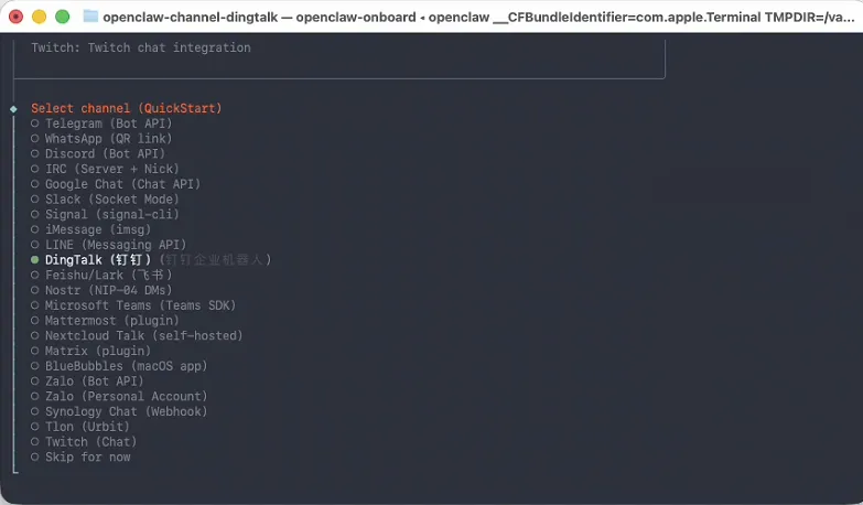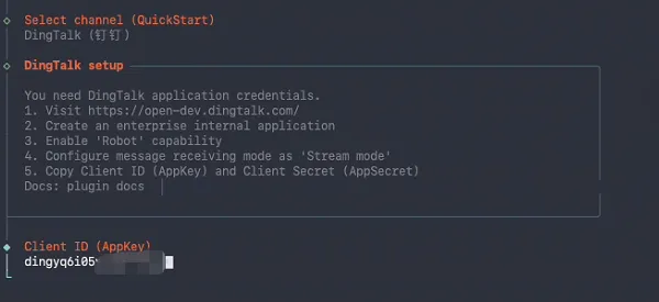 可以看到钉钉插件已经加载成功了,接下来使用openclaw交互配置钉钉插件: