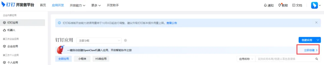 登录后进入应用开发->钉钉应用列表,钉钉有提供一键创建钉钉机器人应用功能: