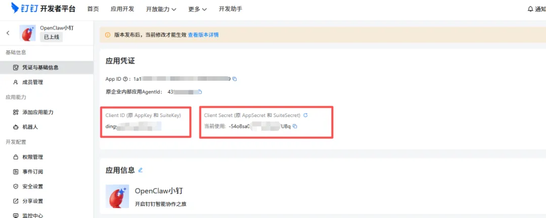 创建完成后,进入应用详情中,点击凭证与基础信息,获取Client ID和Client Secret: