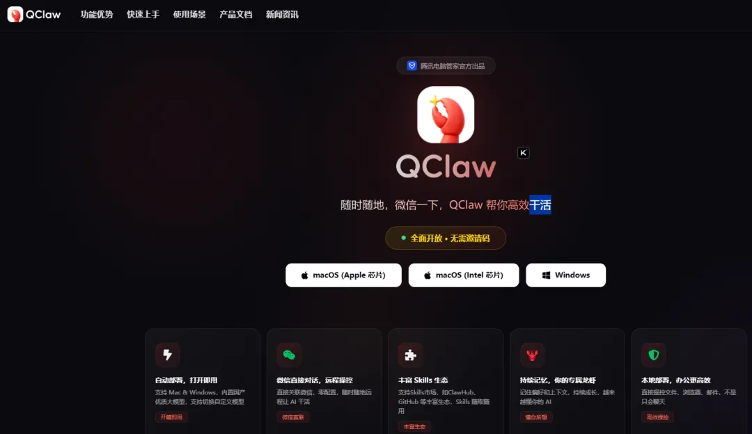 打开QClaw官方网站(qclaw.qq.com 或 claw.guanjia.qq.com),根据自己的电脑系统(Windows/Mac,苹果芯片和Intel芯片均有对应版本)选择下载; 下载完成后,双击安装包,无需手动设置环境变量、API Key,点击“一键安装”,等待1-2分钟即可完成安装; 安装完成后自动启动,初始化后会弹出微信关联提示,可先跳过,后续再绑定也可。