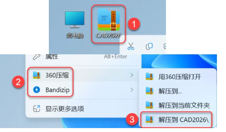 1.解压安装包:①鼠标右击【CAD2026】压缩包②选择电脑上安装的解压软件(如:360压缩)③点击【解压到CAD2026】。