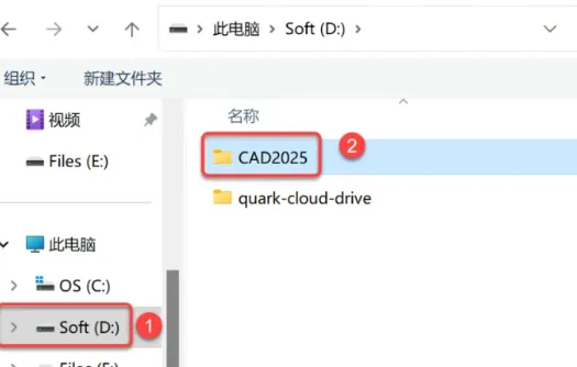 6.修改安装位置:①点击需要将软件安装的磁盘(如:D盘)②新建一个【CAD2026】文件夹并选中③点击【选择文件夹】。