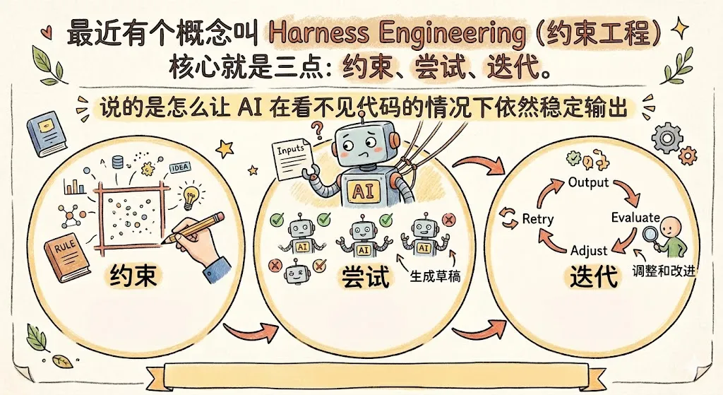 最近有个概念叫 Harness Engineering(约束工程),说的就是怎么让 AI 在看不见代码的情况下依然稳定输出。核心就是三点:约束、尝试、迭代。