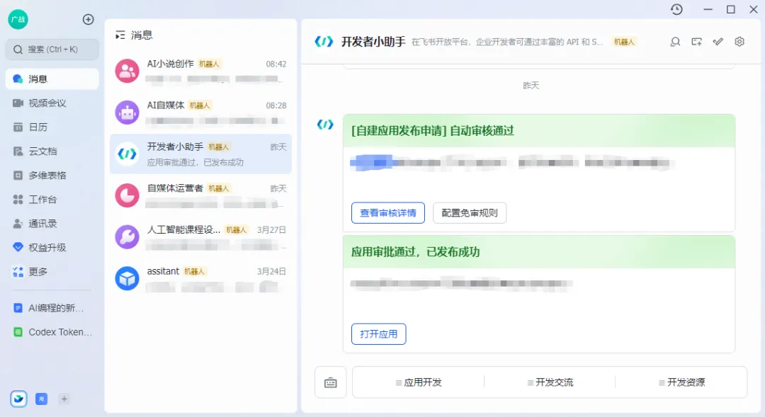 接入飞书之后,最直接的用法之一,就是把它当成文章工作流入口,我们可以飞书的消息界面创建不同的智能体,让它帮助我们助理的不同的工作任务,如图所示。