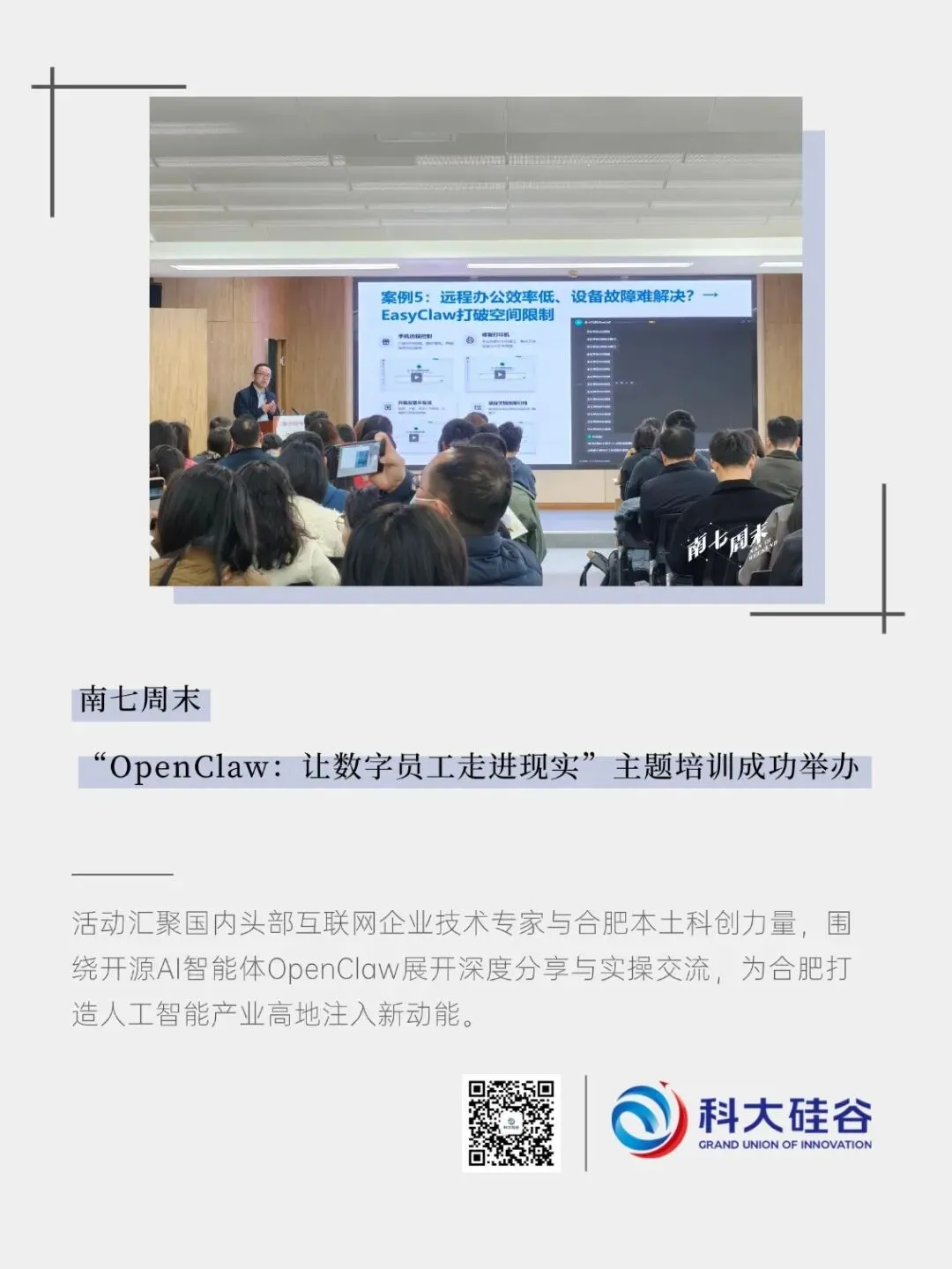 近日,安徽省科技与产业融合创新协会、科大硅谷公司联动合肥市广玉兰英才共同举办“南七周末”系列活动之“OpenClaw:让数字员工走进现实”主题培训。活动汇聚国内头部互联网企业技术专家与合肥本土科创力量,围绕开源AI智能体OpenClaw展开深度分享与实操交流,为合肥打造人工智能产业高地注入新动能。