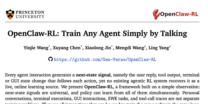 普林斯顿的一个团队刚刚发布了一篇论文,让这种浪费变得无法忽视。OpenClaw-RL。而且与大多数用新缩写重新包装现有想法的论文不同,这篇论文真正发现了整个智能体 RL 社区一直在忽视的一些根本性问题。