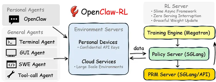 模型在您下一次请求时提供服务,而 PRM 评判您之前的响应,训练器从两个交互之前应用梯度更新。没有组件等待另一个。对于个人智能体,您的设备通过机密 API 连接。对于规模化通用智能体,数百个并行环境在云服务上运行。