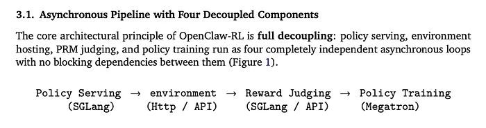 OpenClaw-RL 构建在 slime 异步框架之上,它将所有内容解耦。四个独立循环,零阻塞依赖运行: