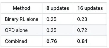 我们认真的吗?单独的 Binary RL 在 16 步后实际上会退化。单独的 OPD 显示延迟收益(稀疏样本,记住?)但最终会艰难攀升。但组合起来?仅 8 次更新后就达到 0.76。从 0.17。