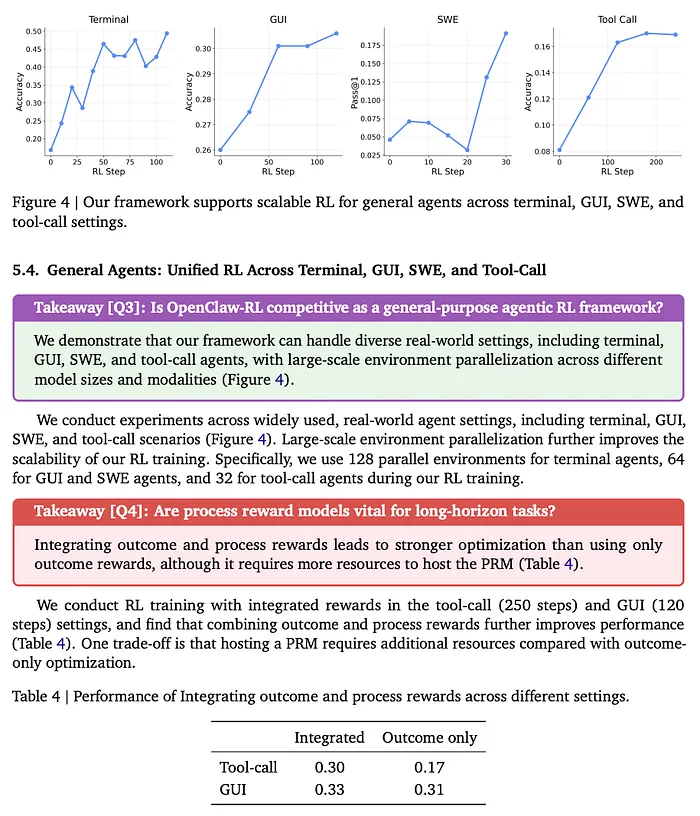 对于通用智能体,他们将过程奖励与结果奖励整合。工具调用的结果:整合奖励 0.30 vs 仅结果奖励 0.17。光是添加逐步 PRM 信号就带来了 76% 的提升。绝对数字不算惊人,但方向性证据很明确:过程奖励对长周期智能体任务很重要,而 OpenClaw-RL 使其在规模化上变得实用。