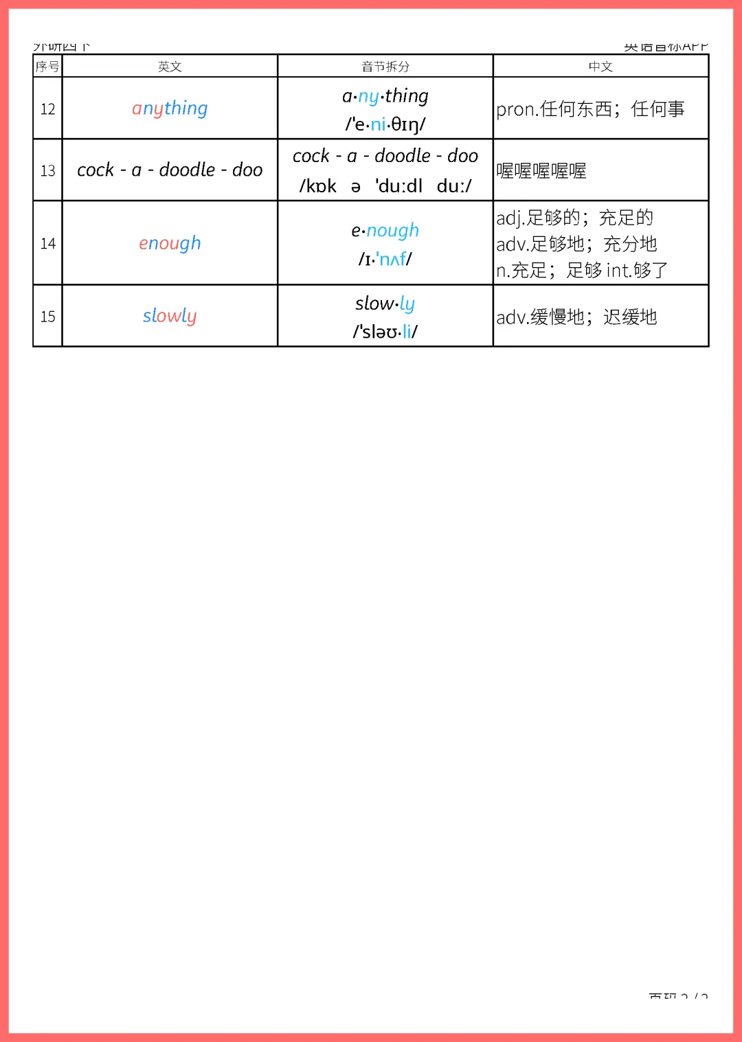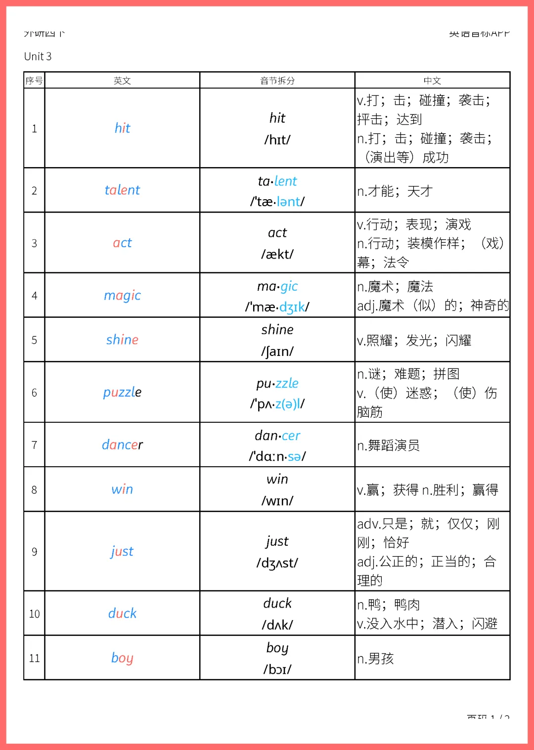 各位家长好!今天分享一份 2024 年外研版四年级下册英语专项资料:Unit 3 音节划分单词背诵默写,共 2 页。这份练习紧扣教材重点,通过科学的音节拆分法,帮助孩子轻松掌握长难单词的拼读规律,有效解决记不住、易混淆的痛点。每天花几分钟练一练,不仅能提升背词效率,还能增强孩子自信心。资源已整理好,需要的家长抓紧打印给孩子练一练吧,让英语学习变得更简单!