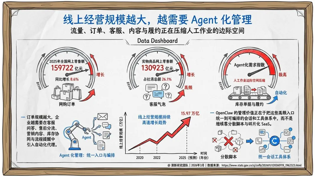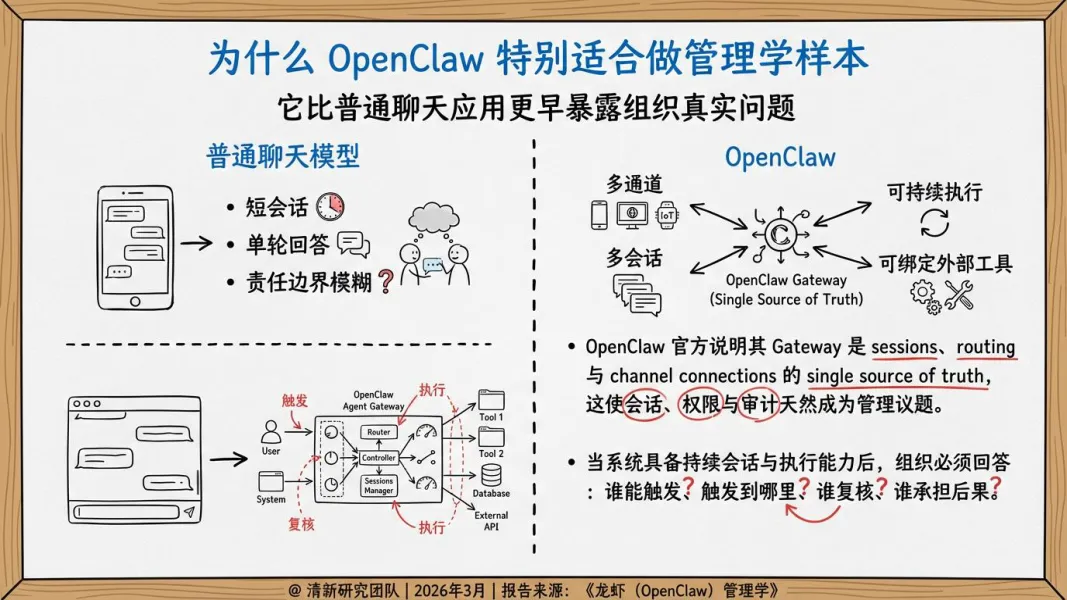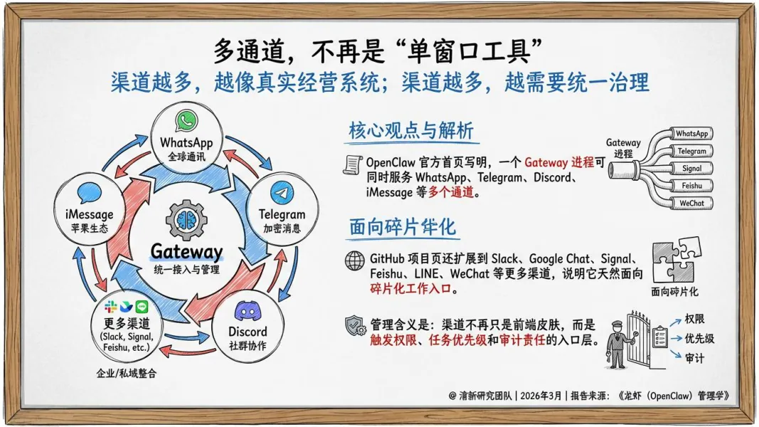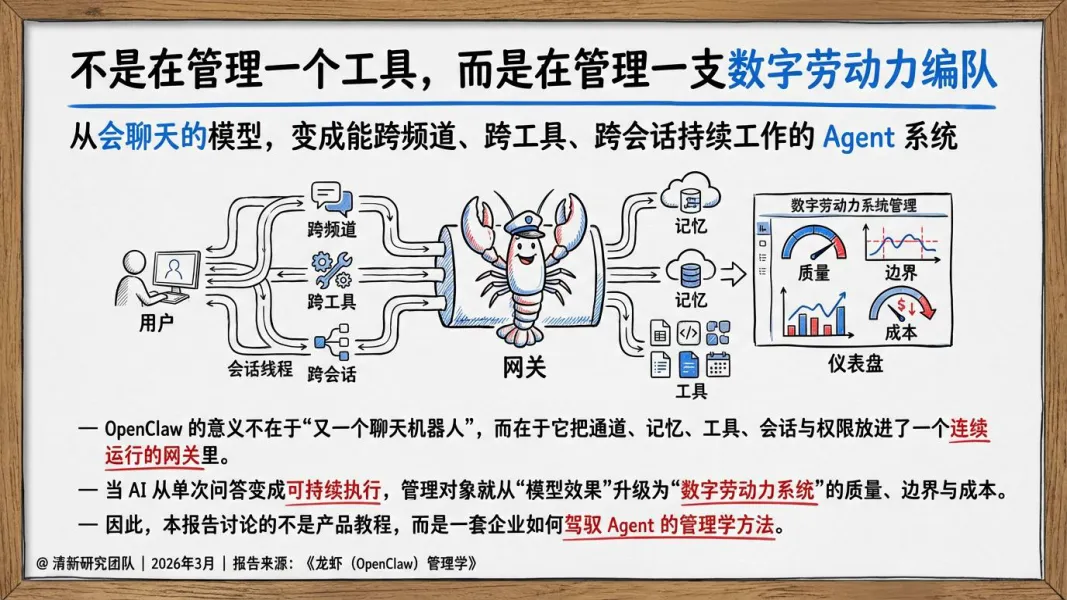 管理对象转型:OpenClaw 代表的不是单一的聊天工具,而是一个可持续在线、可跨通道触发、可调用工具的执行系统(数字劳动力)。因此,企业的管理焦点需从“模型效果”升级为对“数字劳动力系统”的质量、边界与成本的管理。