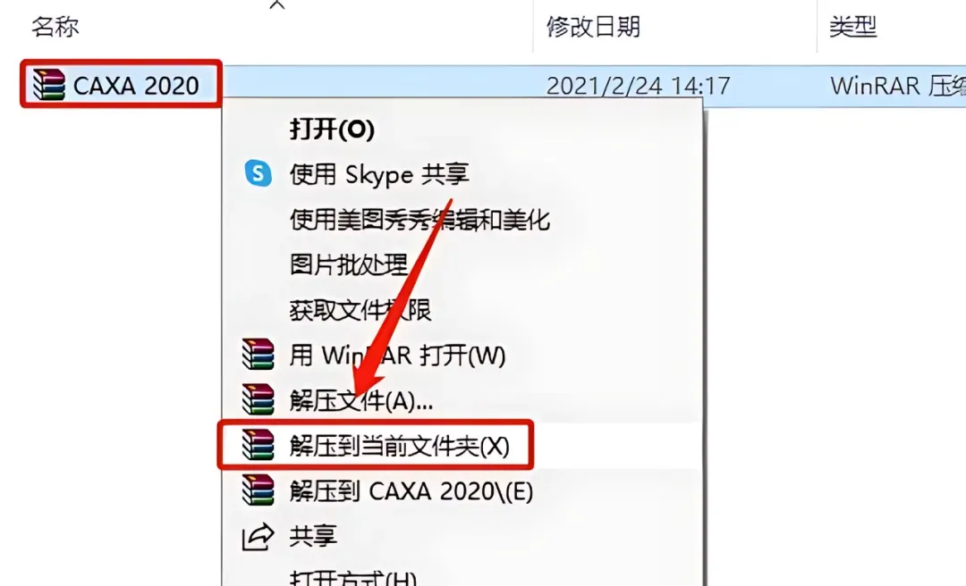 1.打开下载的CAXA2020安装包,右击压缩包选择【解压到当前文件夹】。