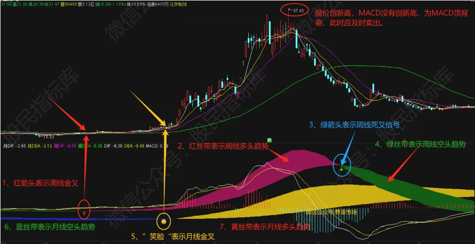 4、MACD月线为”黄色多头趋势,蓝色空头趋势‘;