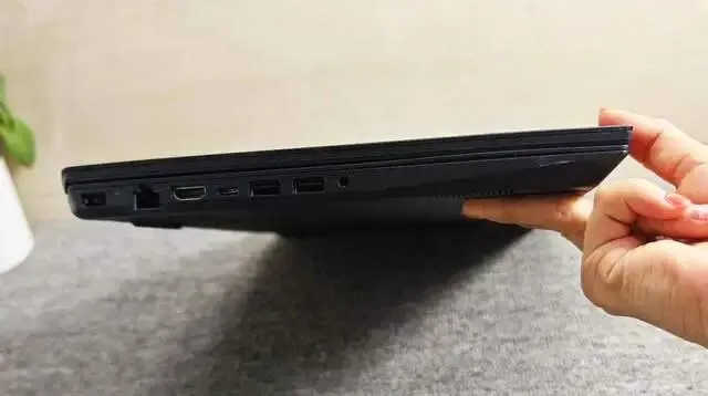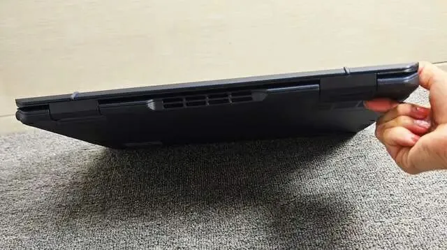 蓝黑色搭配很精致。这台CN15是二手机,是典型的蓝色,但它的蓝很内敛,偏深色系风格。简言之,外壳的a面和c面是蓝色,做成了类磨砂效果,质感细腻,并不耐剐蹭。而b面和d面又改成了黑色,且因为大面积的栅格纹处置,让机身布局变得更加紧凑,d面的进气孔大,转轴处的出风口也大,在高负载下,会明显听到风扇运转的声音,热气呼呼出来。另一面,CN15的重量做到了2.1千克,22.7mm厚度,并不纤薄。
