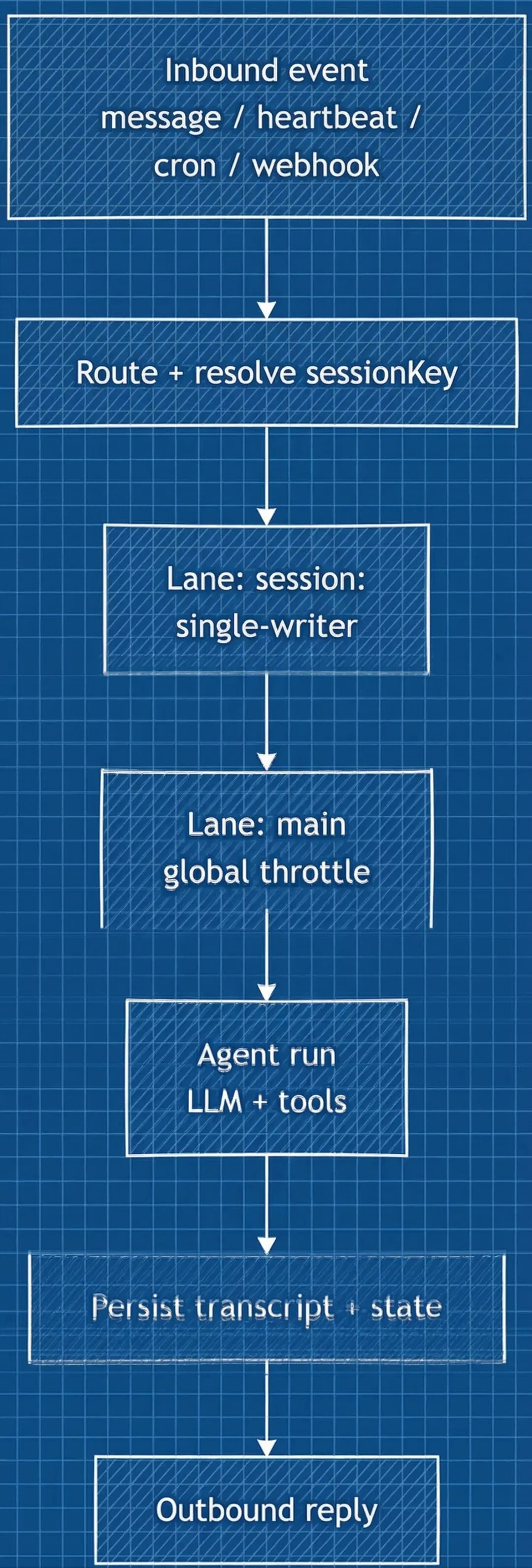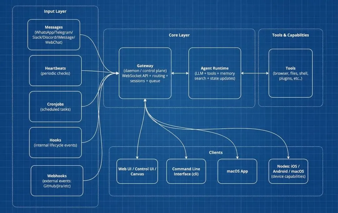 OpenClaw 的调度器统一处理五类输入:用户消息、心跳(默认 30 分钟轮询)、定时任务(Cron)、内部钩子(Hooks)和外部 Webhook。它们走同一套事件循环,不分主次通道。