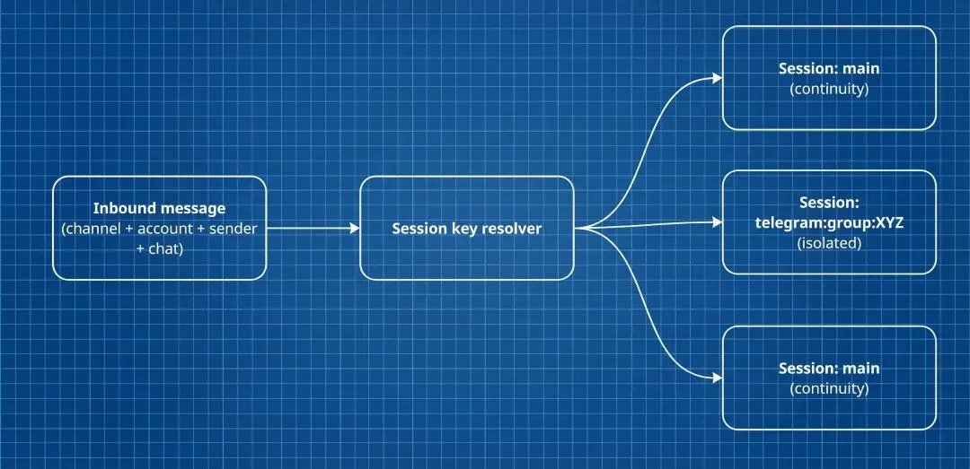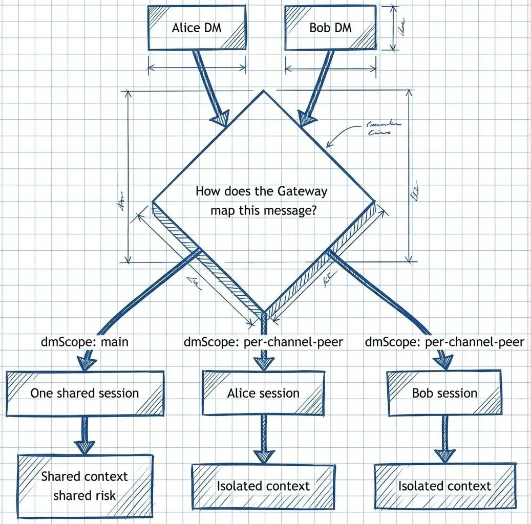 多租户隔离依赖 Gateway 的拓扑切分(dmScope: per-channel-peer):每个通道加对端身份组合,各自持有独立的信任上下文,不允许跨通道复用。