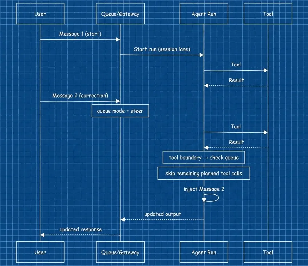 steer 是一种软中断,合法的抢占点只在「工具边界」——也就是模型已经产出 tool_calls 但工具尚未开始执行、或者工具刚返回结果但状态还没写回的时刻。在工具执行到一半时硬杀,除非你定义了补偿事务,否则会留下半提交的副作用。