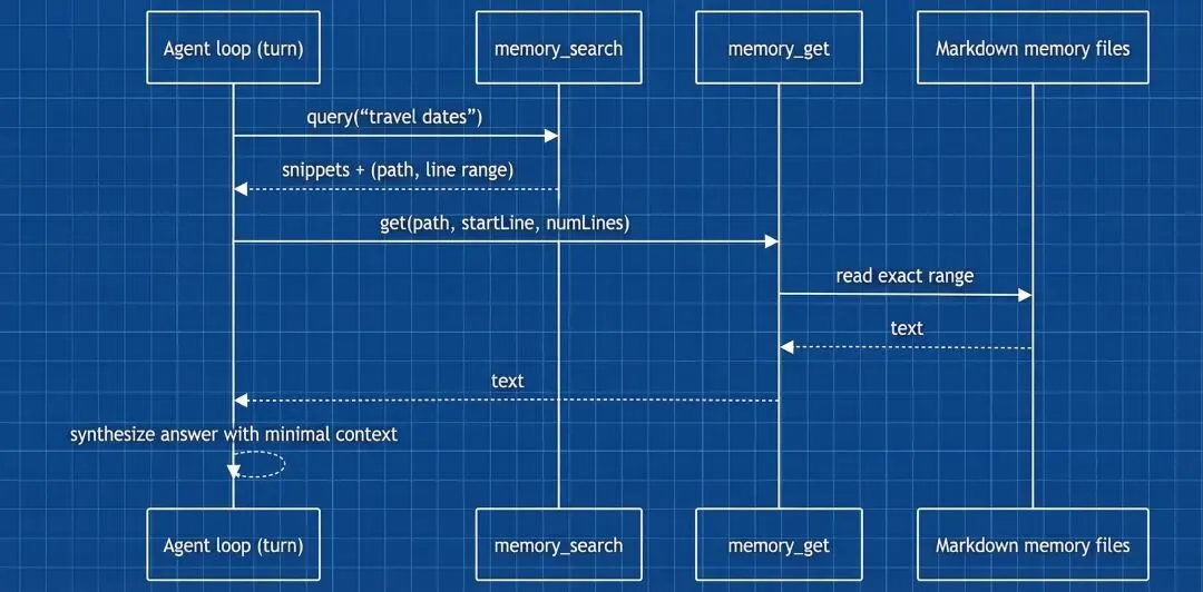 memory_search(query) → 候选列表(id, 摘要, 分数)memory_get(id) → 行级精确记录先搜后取,只把命中的几条精确记录注入 L1。