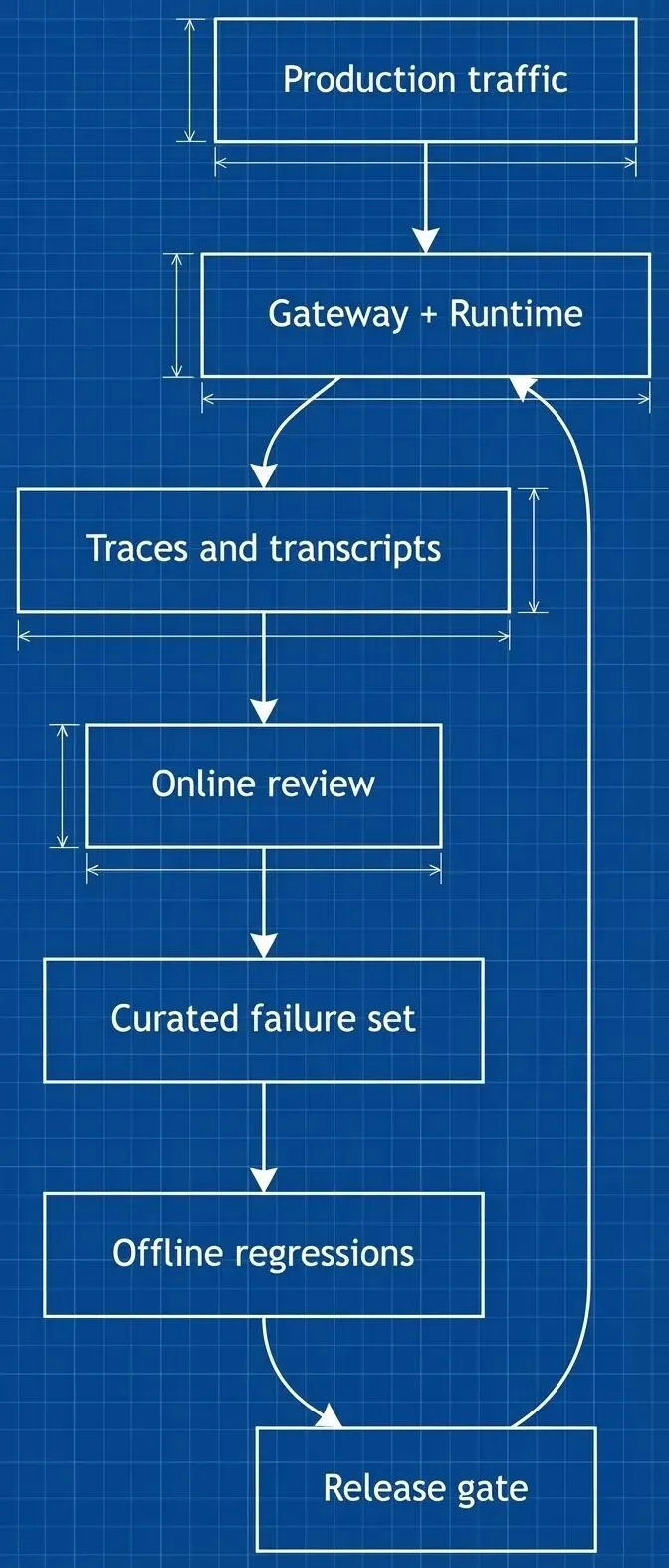 在线旁路:持续采样生产轨迹,检测离群执行——比如同一意图突然产生异常多的副作用、同一个 req_id 触发多条实际副作用路径、Flush 序在 span 上出现倒挂。发现异常后自动降权(收紧能力面)或切只读模式。