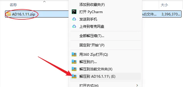 1.解压安装包:鼠标右击【AD16.1.11】压缩包,选择电脑上安装的解压软件,点击【解压到AD16.1.11】。