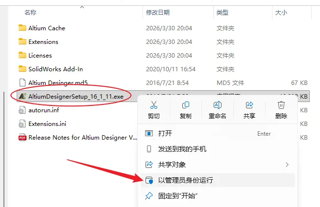 3.选中【AltiumDesignerSetup_16_1_11.exe】可执行文件,鼠标右击选择【以管理员身份运行】。