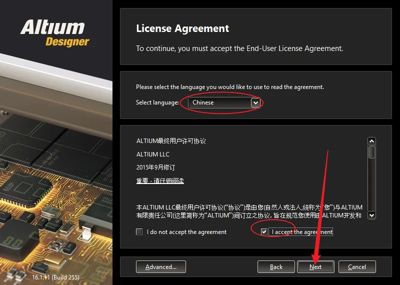 5.选择语言【Chinese】,勾选【I accept……】,点击【Next】。