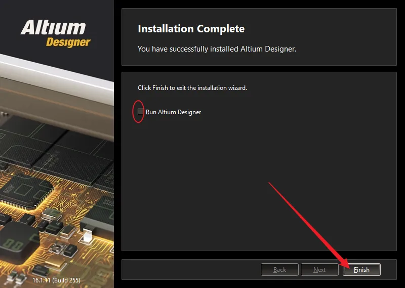 10.安装完成,取消勾选【Run Altium Designer】,然后点击【Finish】。