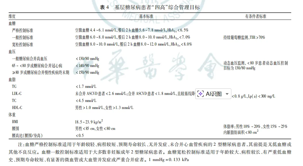 指南下载|基层糖尿病患者“四高”共管中国专家共识(2026版)发布单位:内分泌与代谢性疾病国家临床医学研究中心(长沙),国家糖尿病标准化防控中心(DPCC),中国民族卫生协会糖尿病学分会.文章出处:中国医师杂志,2026,28(02):166-184.摘要:以糖尿病为重点的代谢性疾病,是国家重点关注的四大慢性病之一。糖尿病常与高血压、血脂异常、超重或肥胖(简称“四高”)并存,成为基层慢性病防控的重大挑战。因而制定适配基层医疗资源特点、覆盖“四高”等多种代谢异常的治疗管理共识十分必要。本共识旨在提出基层医疗卫生机构“四高”共管相关药品配备及用药建议,以期提升基层对糖尿病患者“四高”等代谢慢性病的医疗服务水平。关键词:糖尿病;高血压;高脂血症;超重;基层医疗卫生;共识共识背景 随着居民生活方式转变与人口老龄化,以糖尿病为重点的代谢性疾病成为威胁国民健康的重大公共卫生问题。《中国防治慢性病中长期规划(2017—2025年)》将代谢性疾病与心脑血管疾病、恶性肿瘤及慢性呼吸系统疾病列为国家重点防控的四大慢性病,其防控成效直接关系"健康中国2030"目标的实现。新近研究表明,2023年我国年龄标化糖尿病总体患病率达13.7%,预计2050年将达到29.1% 。同时,糖尿病常与高血压、血脂异常、超重或肥胖(简称"四高")并存。我国2型糖尿病患者中,约60%合并高血压 ,67%合并血脂异常,42%合并超重及25%合并肥胖。代谢慢性病共存及胰岛素抵抗等共同发病基础协同促进,显著增加心脑血管疾病和慢性肾脏疾病的发生风险。因此,以糖尿病为基础的"四高"共管对于降低心肾疾病负担和改善整体健康结局具有重要意义。基层医疗卫生机构承担80%以上的糖尿病基本医疗服务,是代谢慢性病防控的"主战场"。2024年国家卫生健康委牵头制定并印发《健康中国行动——糖尿病防治行动实施方案(2024—2030年)》,将糖尿病防治纳入"健康中国"战略核心部署,强调完善以"强基层"为重点的分级诊疗服务体系。但当前基层医疗实践中,针对"四高"共病的管理存在诸多短板:一方面,基层药品配备难以覆盖多种代谢异常的联合治疗需求,部分指南推荐药物在基层可及性不足;另一方面,缺乏适配基层诊疗能力的"四高"共管整合路径,医护人员对多种疾病协同管理的认知与能力有待提升,导致仅约6%的患者实现血糖、血压、血脂综合达标 。因此,制定适配基层医疗资源特点、覆盖"四高"等多种代谢异常的治疗管理共识十分必要。本共识旨在提出基层医疗卫生机构"四高"共管相关药品配备及用药建议,以期提升基层对糖尿病患者"四高"等代谢慢性病的医疗服务水平,改善患者长期结局,降低社会整体疾病负担。共识适用范围共识适用人群:本共识适用于基层医疗卫生机构(包括社区卫生服务中心/站、乡镇卫生院、村卫生室、医务室、诊所等)及部分地区县级医院的医务工作者。共识管理对象:年龄≥18岁,合并高血压、血脂异常、超重或肥胖的 2型糖尿病患者。点击链接 免费下载:基层糖尿病患者_四高_共管中国专家共识(2026版).pdf本文内容仅供医疗专业人士学习交流使用,如果侵权,请联系删除。