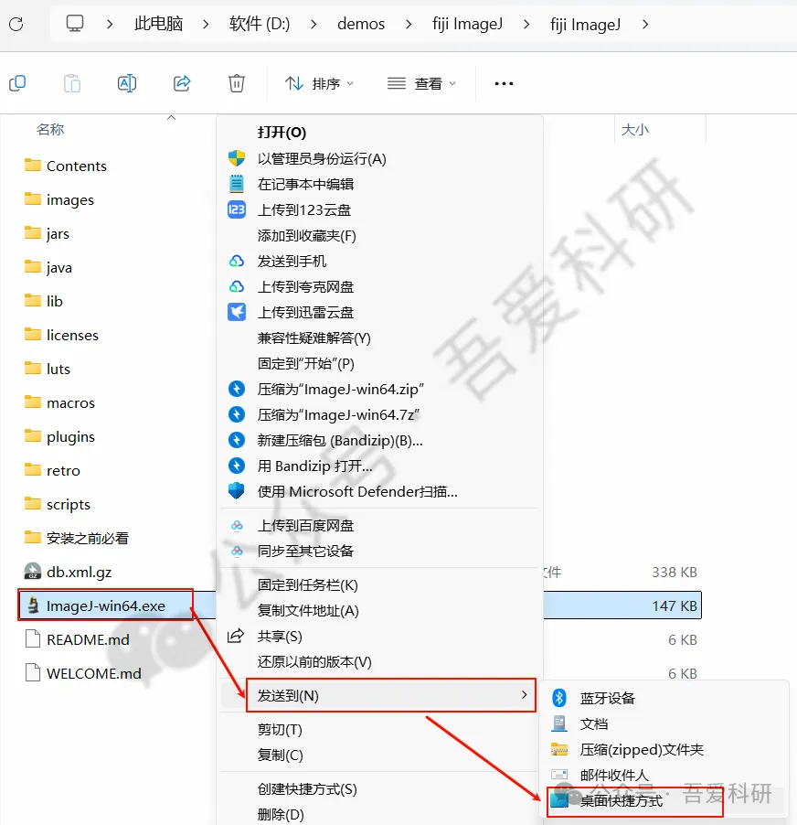 2.选中“ImageJ-win64.exe”发送到桌面快捷方式(安装包不能放在中文路径下,否则无法打开)