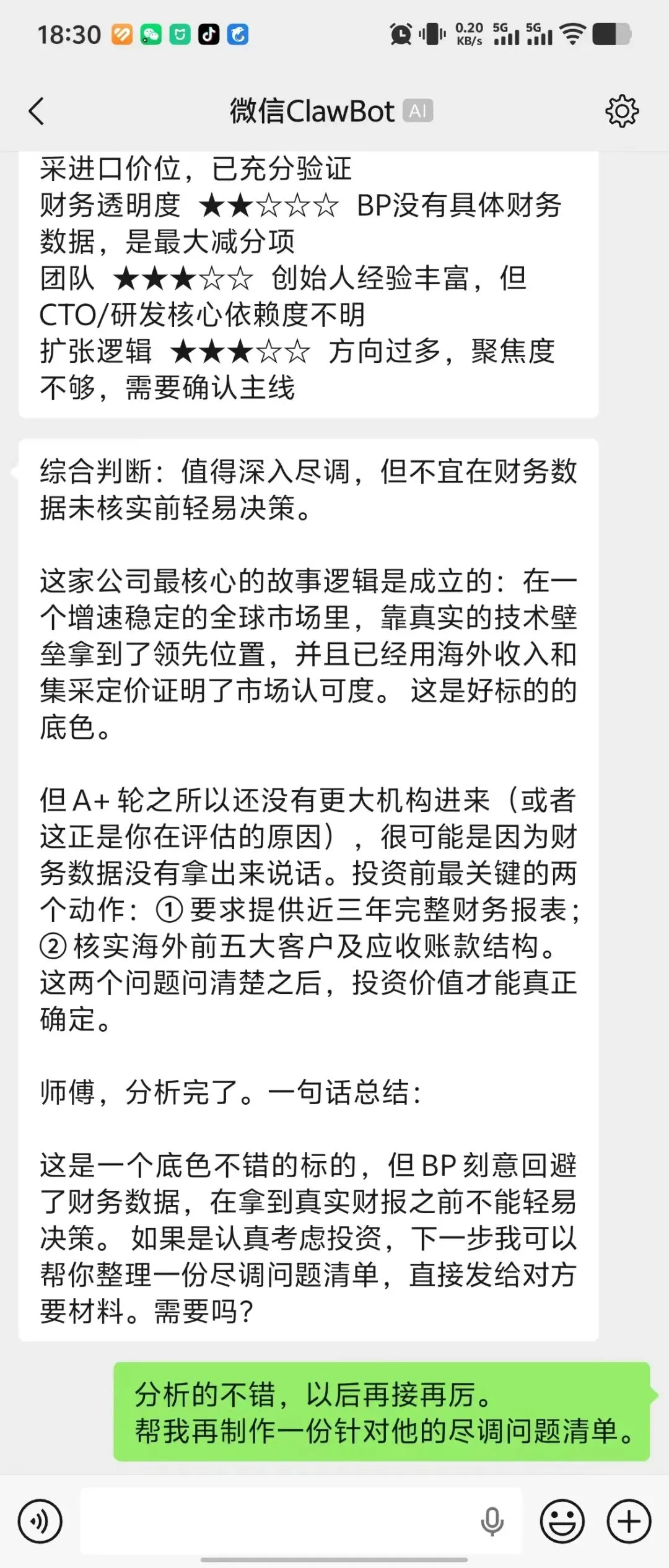 🔍 额外收获:更厉害的是,龙虾还帮我列了详细的尽调清单,针对每一个问题都有详细的检查项: