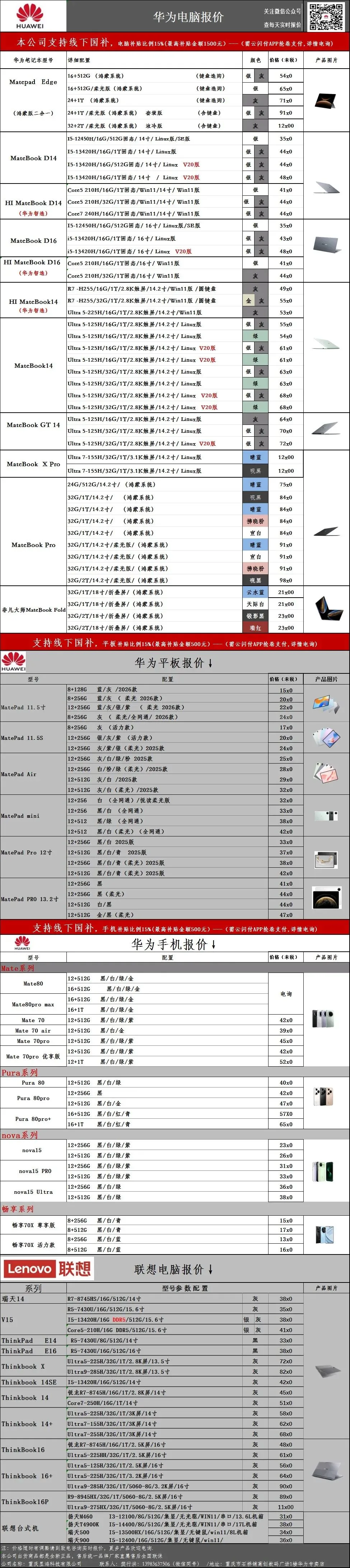 华为(电脑/平板/手机),联想电脑2026年4月1日批发报价!