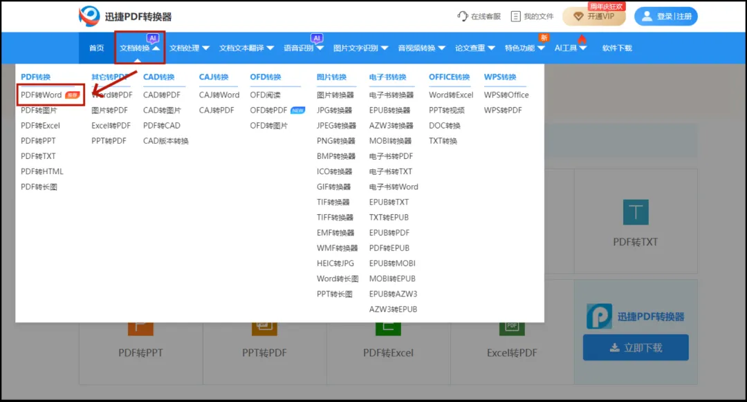 1、在浏览器搜索“迅捷PDF转换器在线版”并进入官网,在网站顶部导航栏,鼠标悬停在【PDF转换】上,在下拉菜单中点击【PDF转Word】;