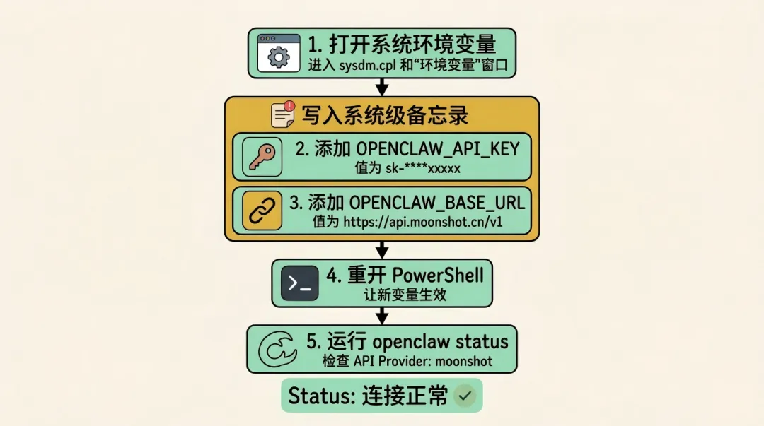 简单说,环境变量就是「系统级的备忘录」。你把 API Key 写进去,OpenClaw 启动时会自动读取。