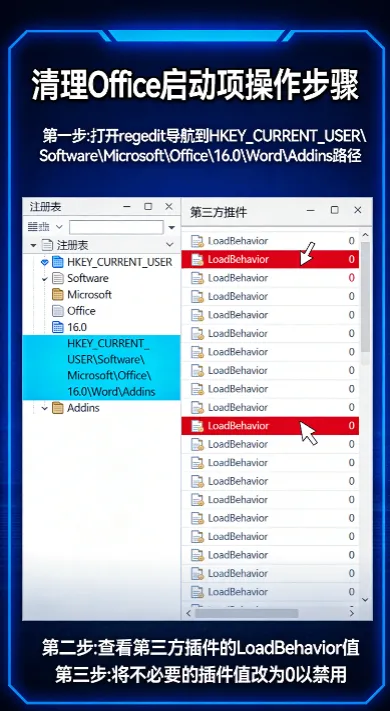 场景:通过常规方法无法完全禁用某些顽固插件,Office启动时仍有残留 适用人群:IT技术人员、高级用户,或由IT部门指导操作的普通用户 效果:彻底清除插件残留,解决因插件冲突导致的崩溃、卡死问题 重要提醒:修改注册表前务必备份,不熟悉的键值不要随意更改