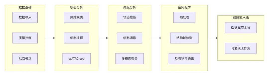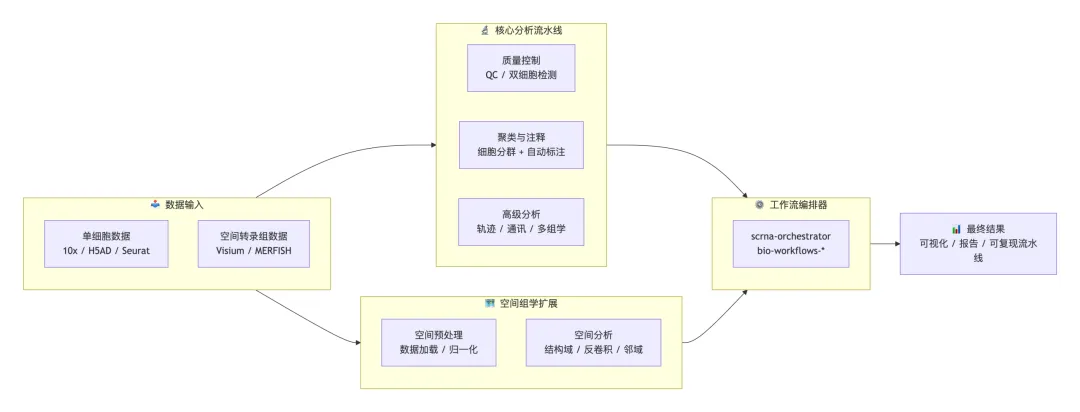 单细胞与空间组学技能被组织为分层架构,这反映了从业者实际构建分析的方式。在底层,数据 I/O 与预处理技能负责格式转换与质量过滤。其上方的核心分析技能执行降维、聚类与注释。高级分析层增加了轨迹推断、通讯网络和扰动分析。最后,空间组学技能通过组织上下文处理扩展了单细胞方法,而编排技能则将所有内容串联为可复现的流水线。
