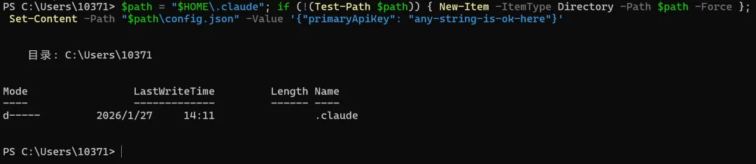 $path = "$HOME.claude"; if (!(Test-Path $path)) { New-Item-ItemType Directory -Path $path -Force }; Set-Content-Path"$path\config.json"-Value'{"primaryApiKey": "any-string-is-ok-here"}'