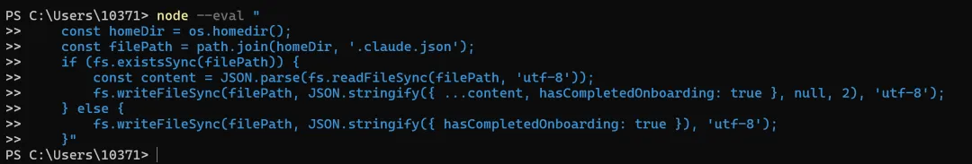 {"hasCompletedOnboarding":true}快速设置命令 (PowerShell): 使用 Node.js 脚本一键写入: