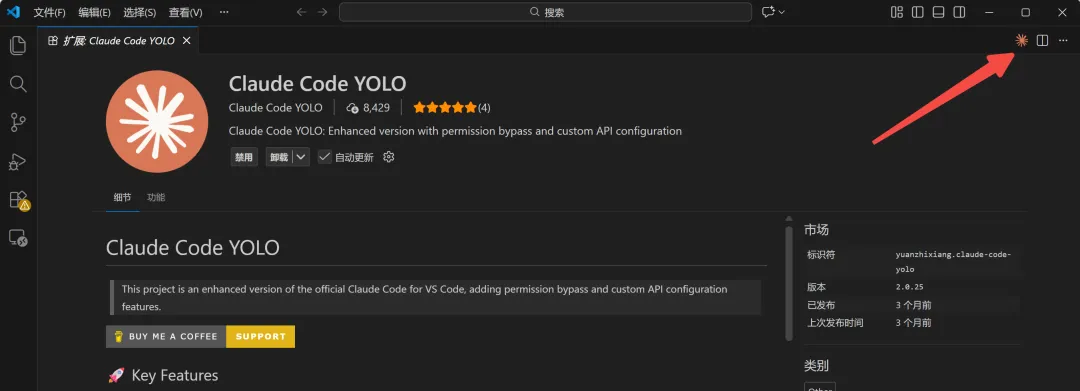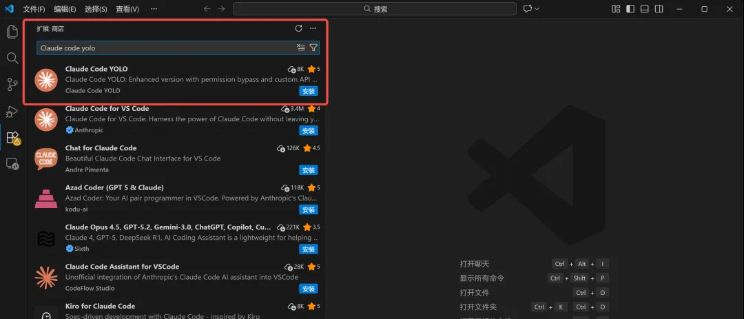 安装 Claude Code Yolo 插件打开 VS Code,进入扩展市场,搜索并安装 Claude code yolo(建议输入完整名称)。这款定制化插件支持在 UI 界面中直接设置第三方模型相关参数。