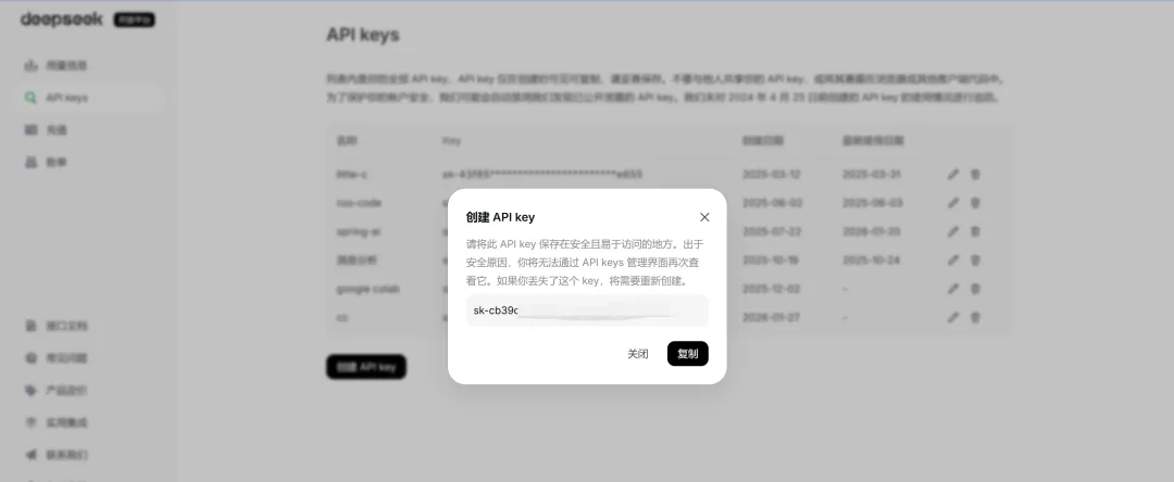 前往DeepSeek开放平台(https://platform.deepseek.com/api_keys)申请 API key。