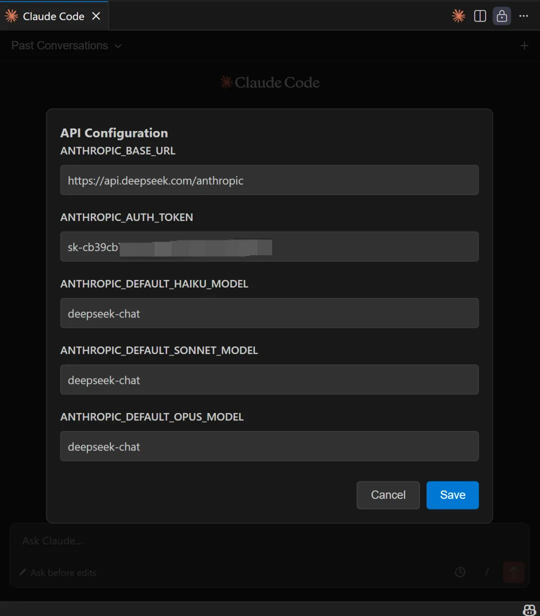 启动后,在 Claude Code 输入框中输入 /,选择 API configuration (或类似 Config 选项),进入配置界面。