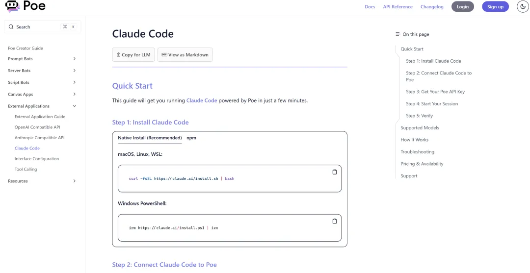 除了直接对接 DeepSeek,你还可以自由配置各类中转 API 服务。下面以 **Poe** 为例进行演示: 参考文档:Poe 官方已提供 Claude Code 对接教程,可直接查阅:https://creator.poe.com/docs/external-applications/claude-code 注:可根据自身需求选择常用的中转平台,整体配置思路基本一致。