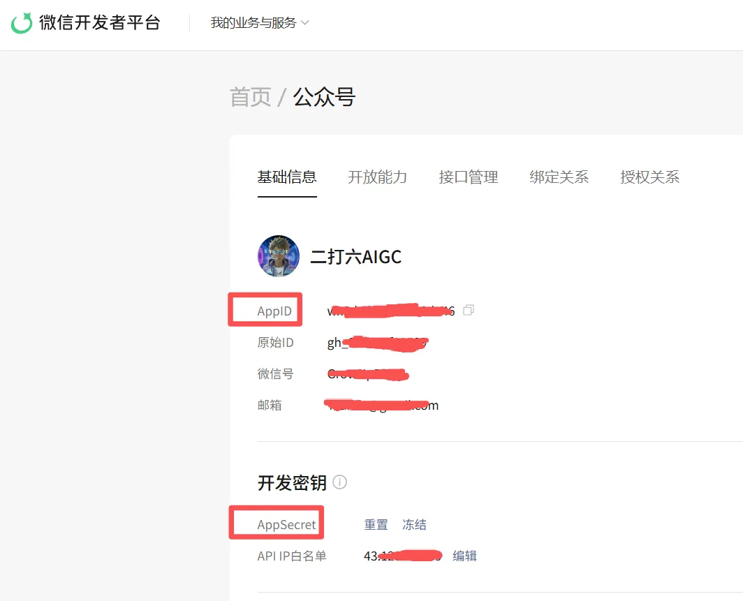 进入到微信开发者平台,选择公众号,复制APPID,AppSecret第一次生成需要保存下来,后续不会再显示。